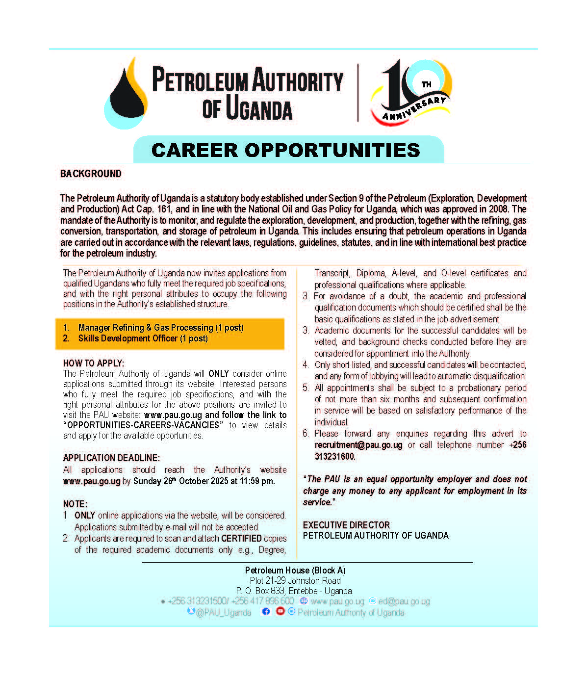 EXTERNAL JOB ADVERT NUMBER 2 OF 2024 BACKGROUND The Petroleum Authority of Uganda (PAU) is a statutory body established under Section 9 of the Petroleum (Exploration, Development and Production) Act 2013, and in line with the National Oil and Gas Policy for Uganda, which was approved in 2008. The mandate of the Petroleum Authority of […]